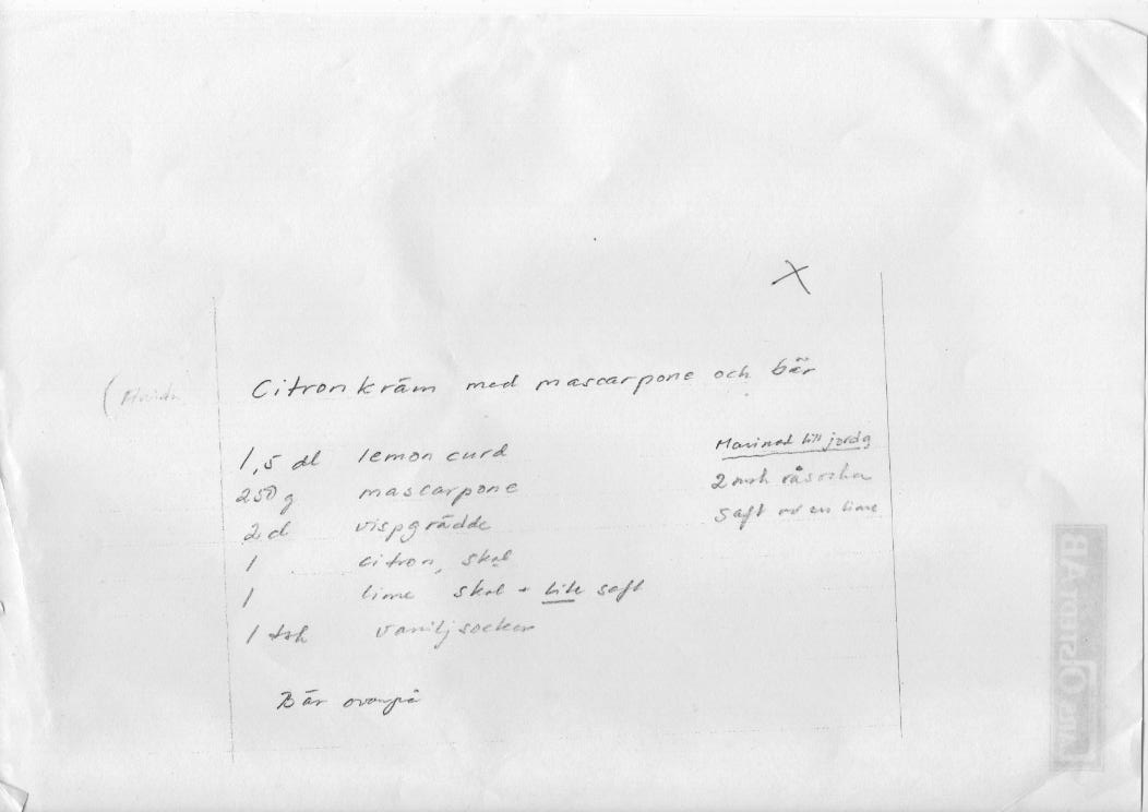 Blanda ihop lemon curd, mascarpone, grädde, skal av en citron, skal och saft av lime samt vaniljsocker till en jämn smet.