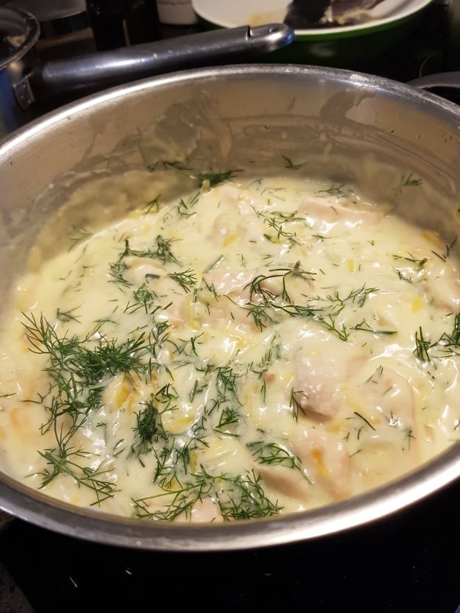 Finhacka dillen. Skär laxen i cm-stora kuber och vänd försiktigt ner dem tillsammans med dillen i såsen. Låt småputtra i 5 minuter och servera grytan med nykokt potatis eller ris.