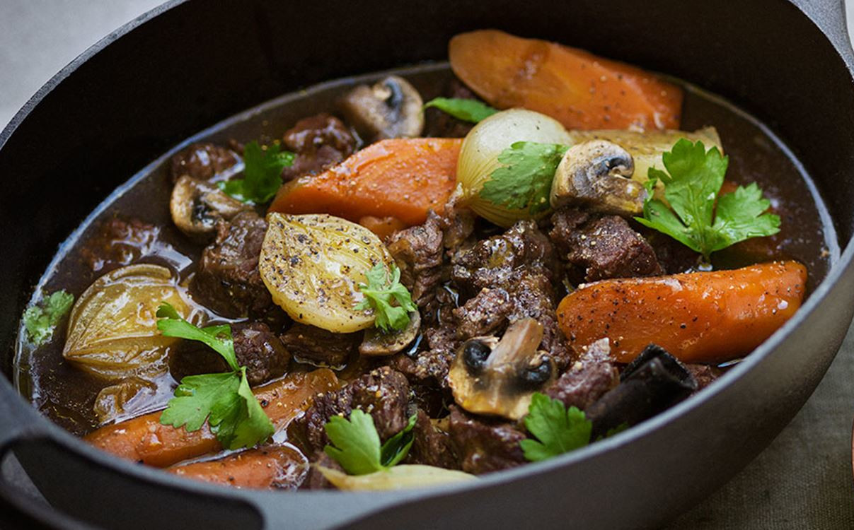 Salta, krydda, strö över mjöl och rör om. Späd med buljong och rödvin och låt grytan bräsera ca 1 timme eller tills köttet känns mört. Tiden beror på vilken styckningsdel som används